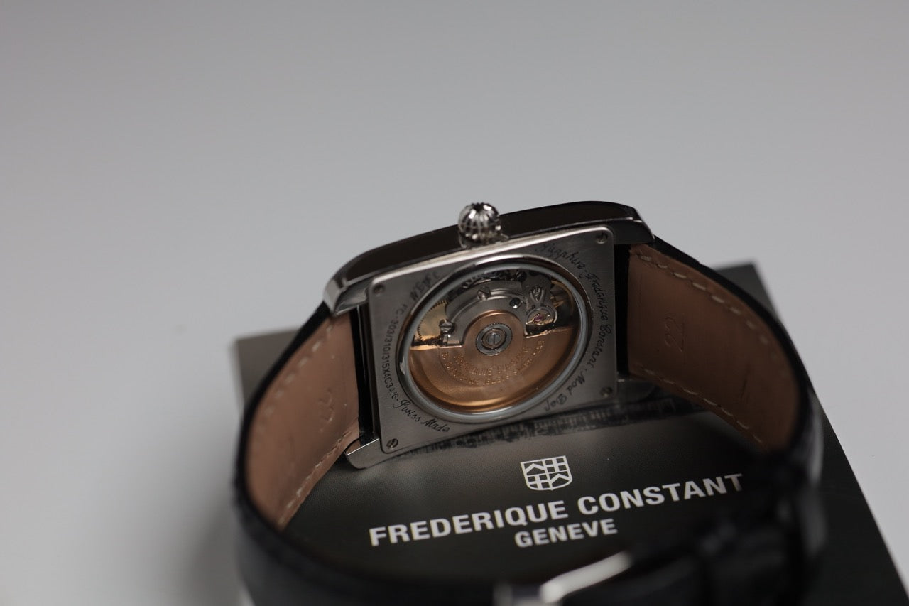 The Frédérique Constant Carrée It asserts a traditional watchmaking aesthetic. The date window at 6 o'clock integrates harmoniously into the balance of the dial, reinforcing its dressy character. Powered by a Swiss automatic movement, the Frédérique Constant Carrée combines tradition and mechanical reliability.