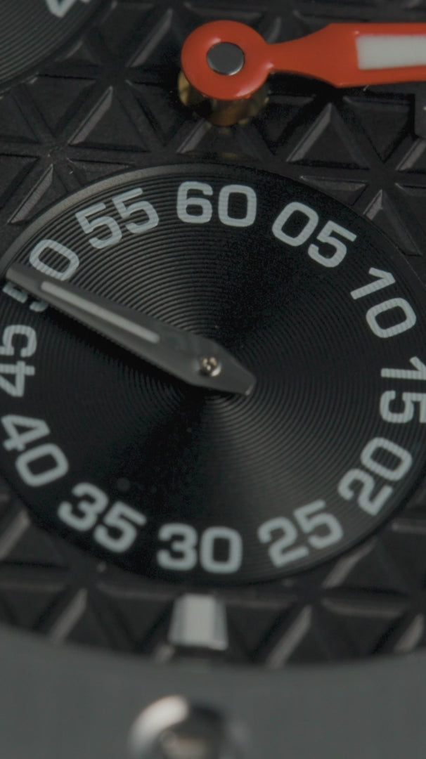 Disposition : Affichage régulateur avec une grande aiguille centrale orange pour les minutes, un sous-cadran à 10 heures pour les heures, et un sous-cadran à 6 heures pour les secondes, offrant une lecture optimale de l'heure.