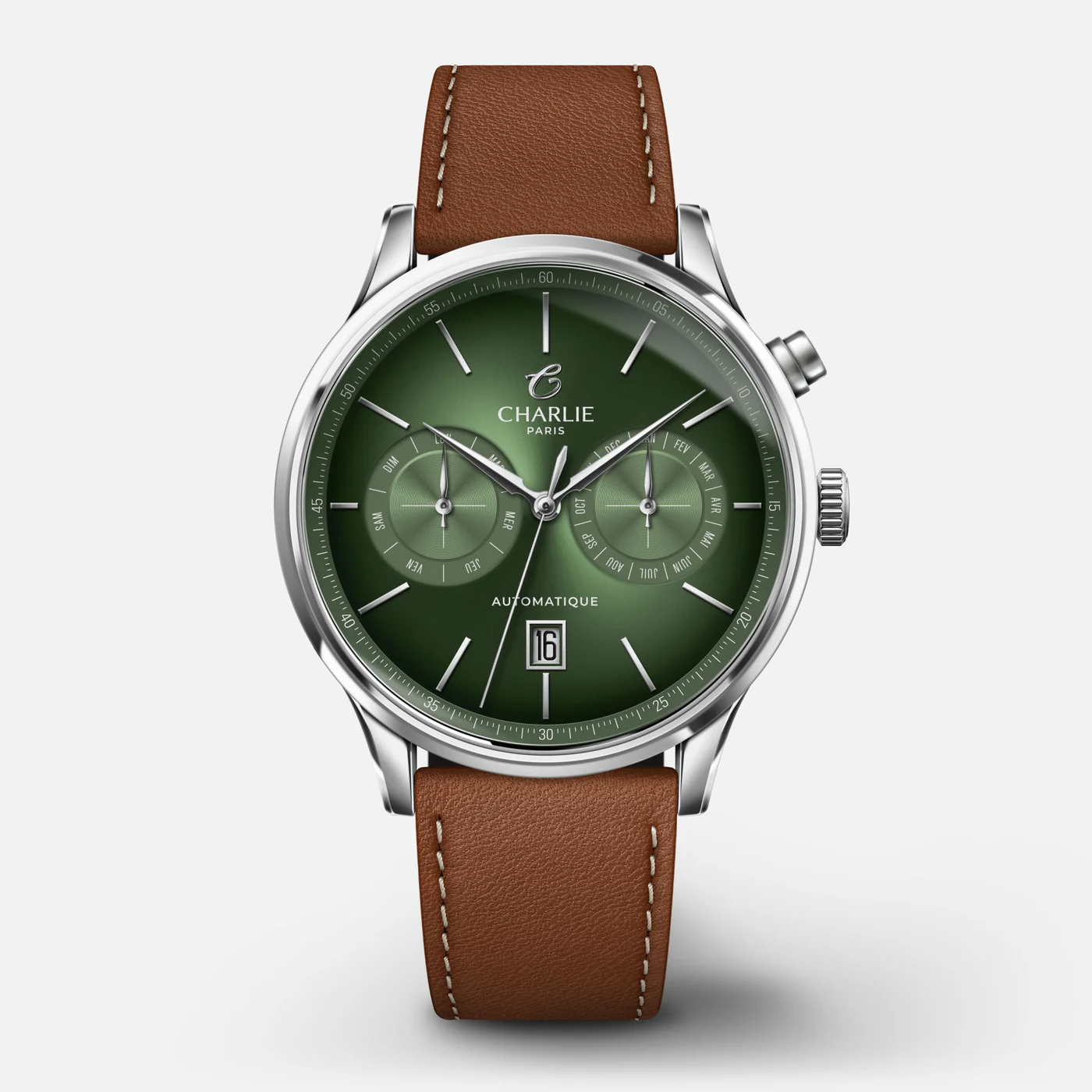 La Charlie Paris Initial Calendrier Vert séduit par son design sophistiqué et équilibré, intégrant des complications utiles dans une esthétique épurée. Son calibre Miyota fiable, son format polyvalent, et son fini soigné font de ce modèle un choix idéal pour ceux qui apprécient une montre élégante avec une touche de couleur, sans compromis sur la qualité.