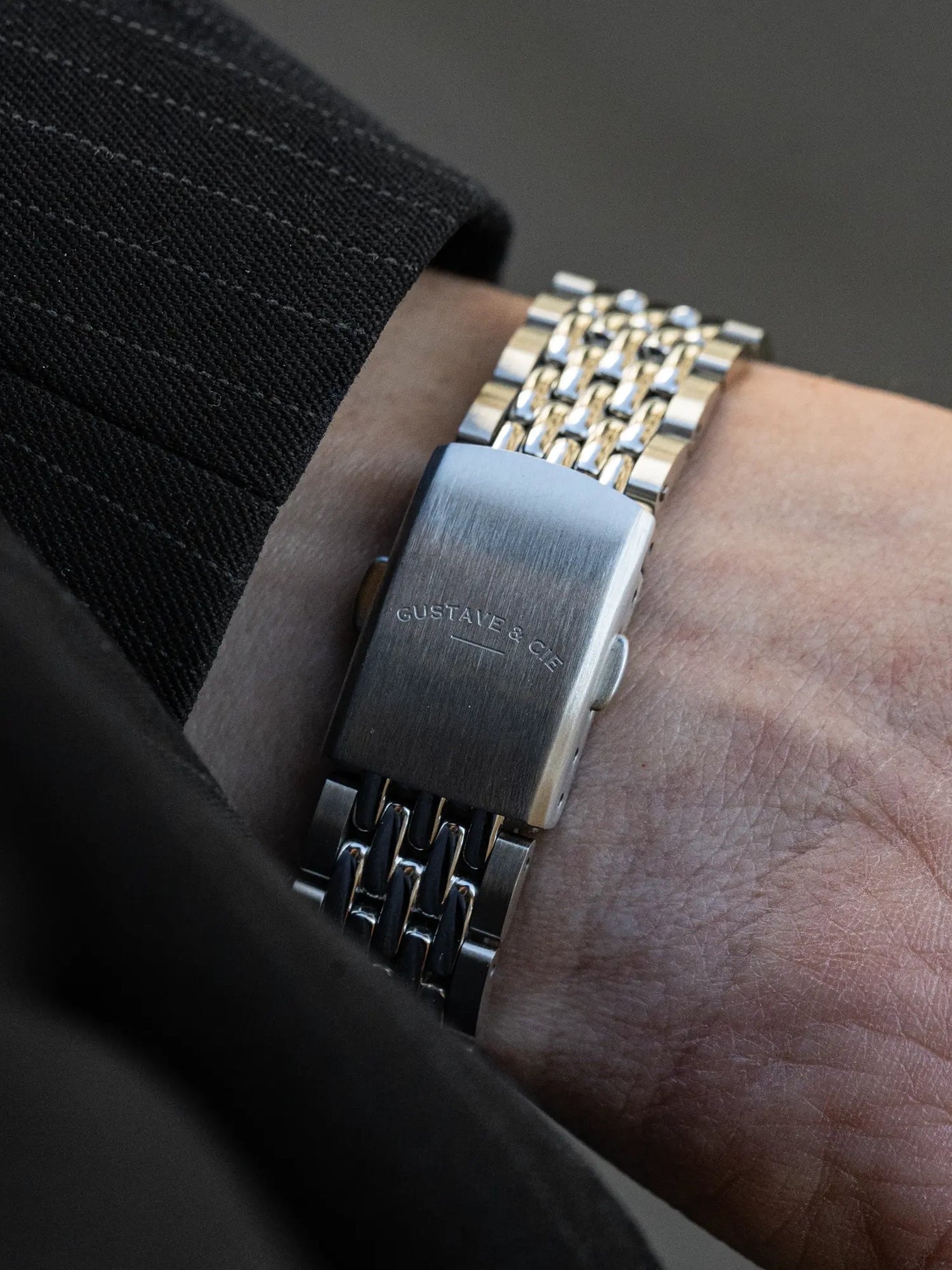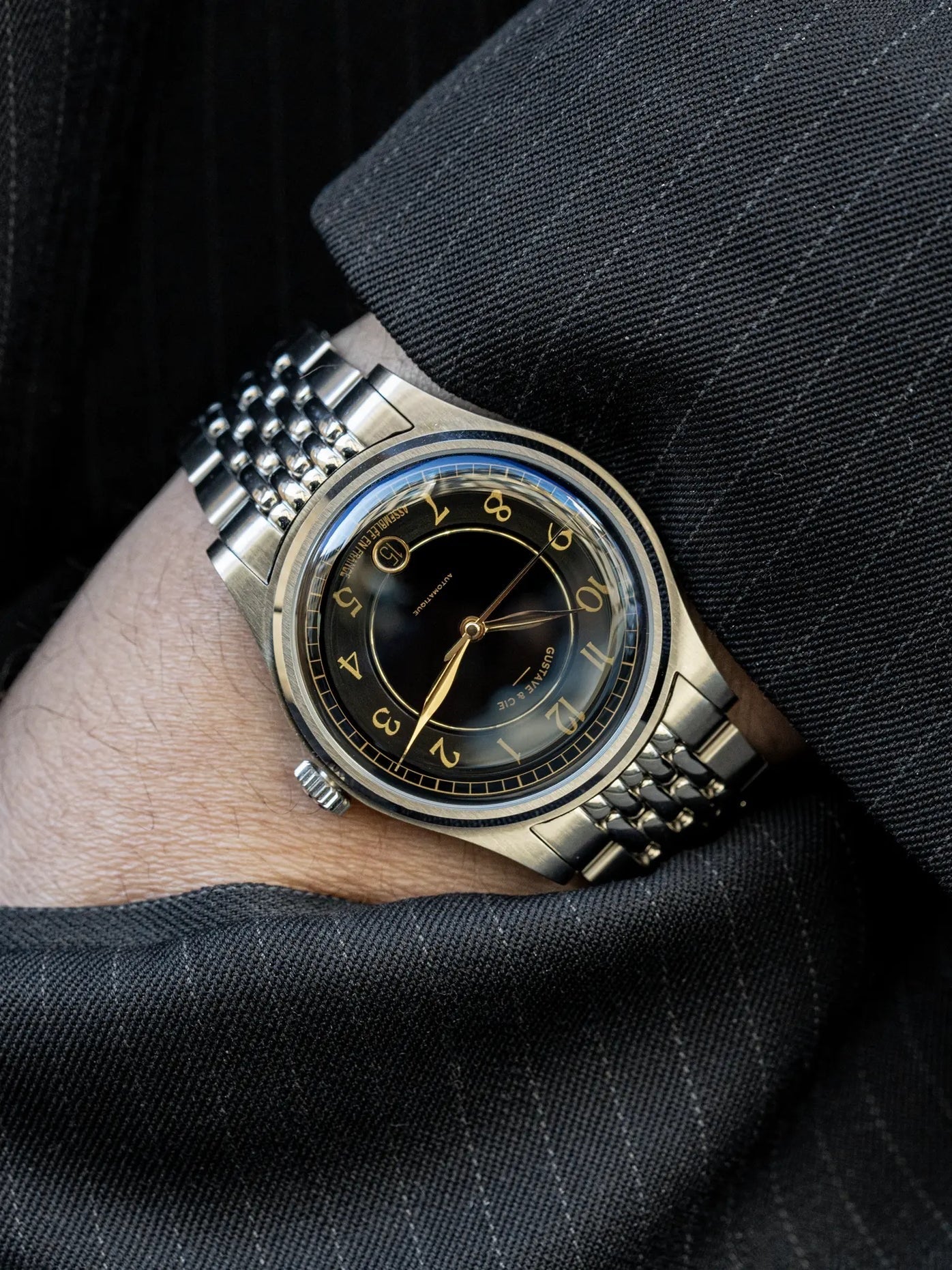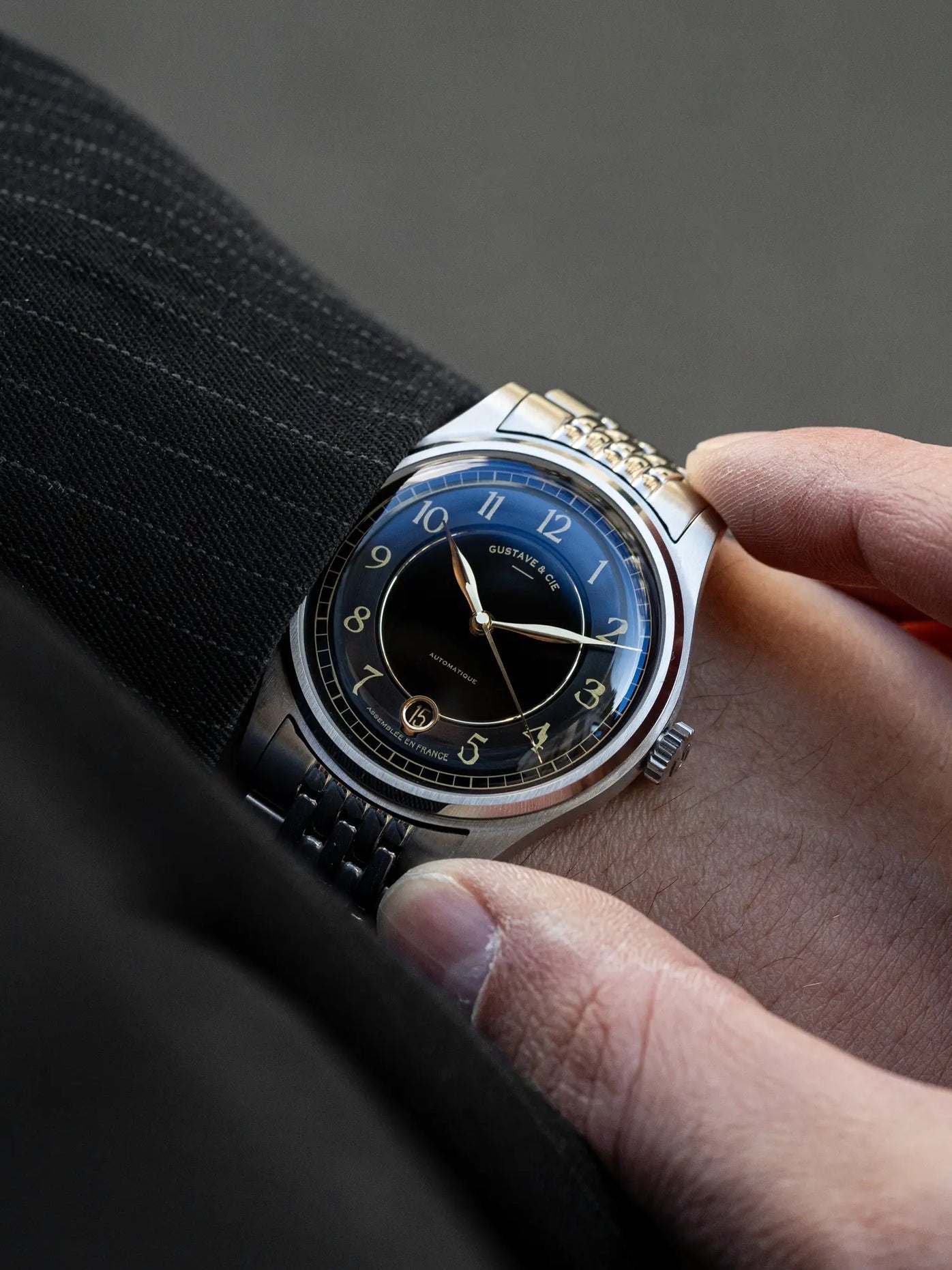 Animée par un calibre automatique Miyota 9015, la Gustave Charles Noire offre une réserve de marche d’environ 42 heures. Son étanchéité de 5 ATM permet un usage quotidien sans compromis. Montée sur bracelets cuirs ou acier « grain de riz », cette montre Gustave & Cie s’impose comme un garde-temps mécanique de caractère pour les amateurs d’élégance française.