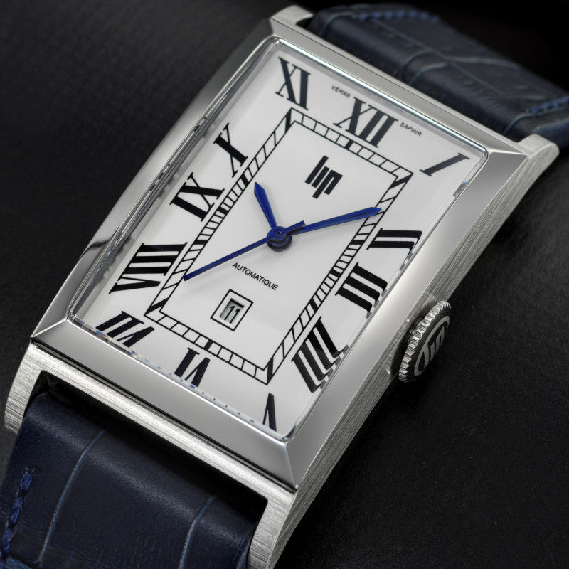 La esfera plateada guilloché de esta versión del Churchill T26 está estructurada por números romanos negros y finas agujas azuladas, lo que garantiza una excelente legibilidad. La ventana de fecha, situada a las 6, añade un toque relojero tradicional y refuerza el carácter clásico del LIP T26.