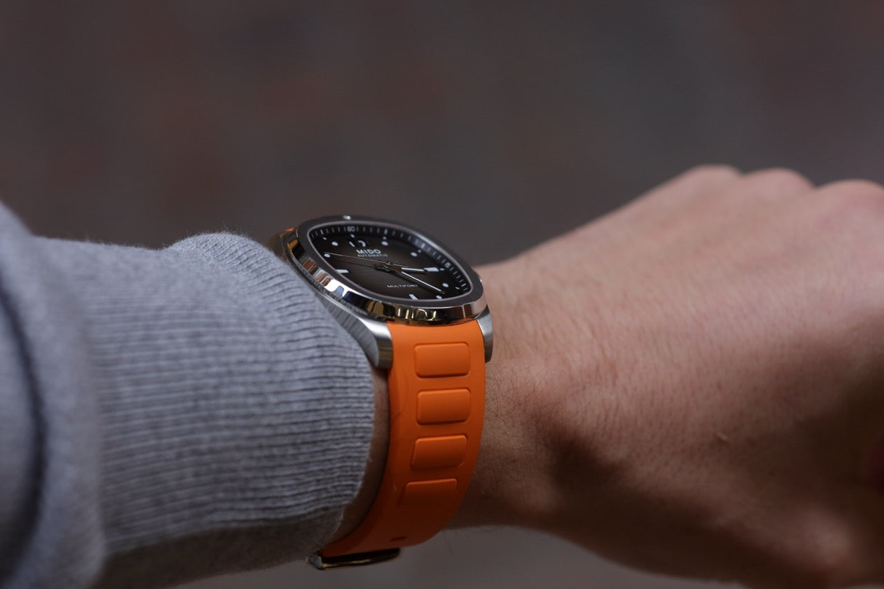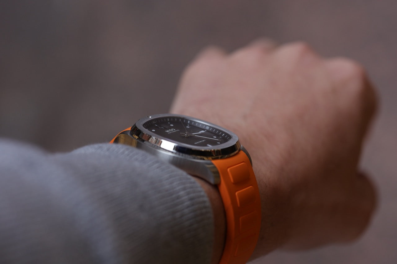 Bracelet : Caoutchouc orange, 22mm d'entre corne, boucle ardillon acier