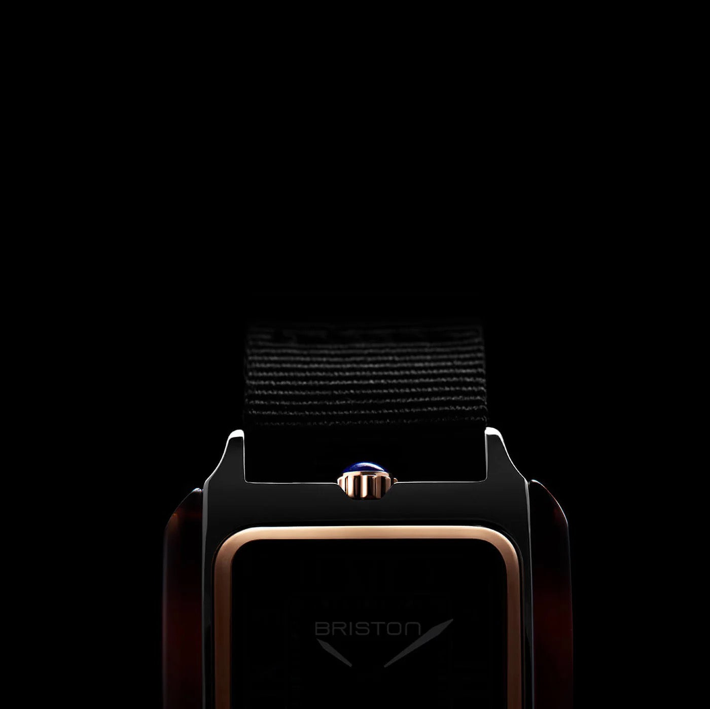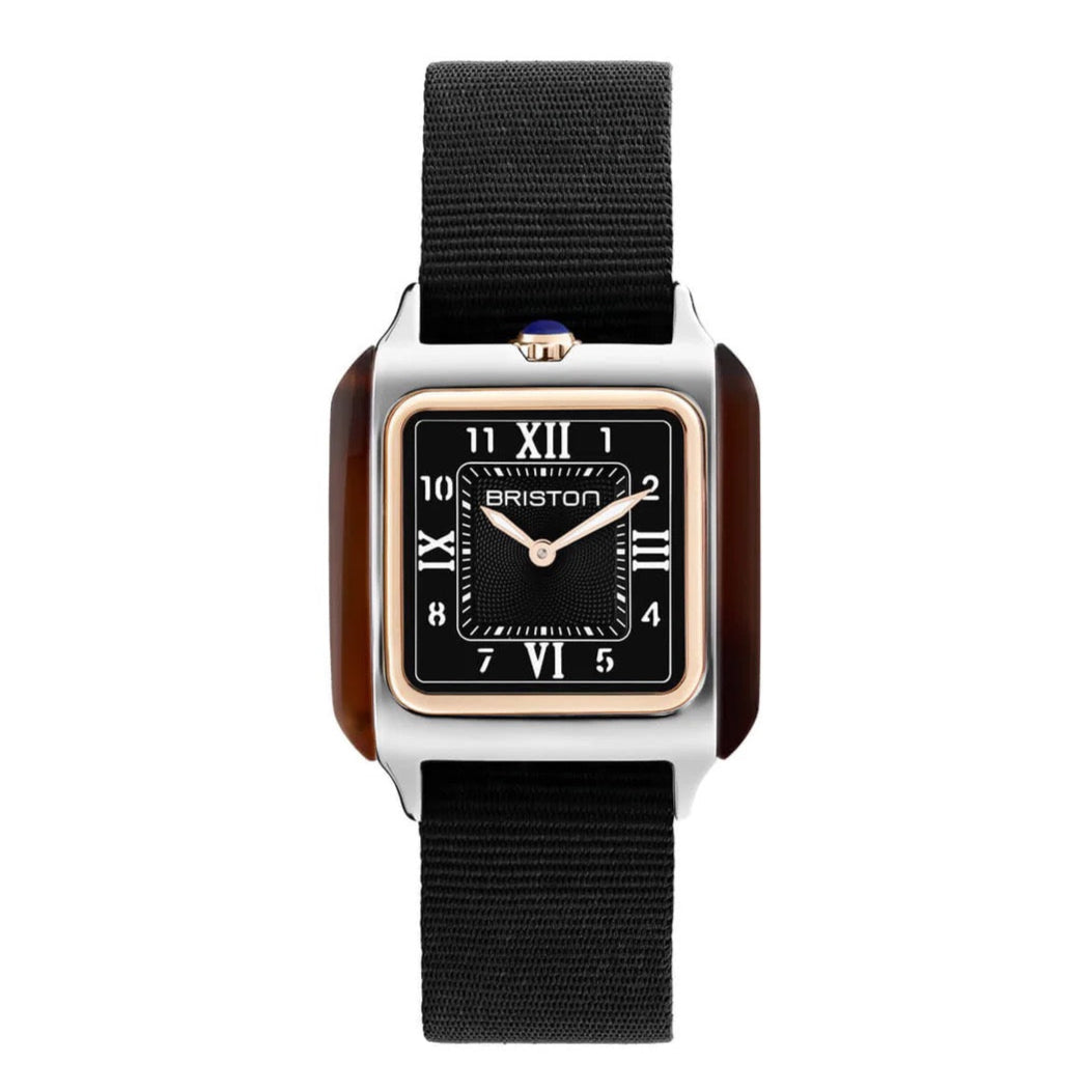 La Briston Streamliner Kennedy 252030.PRA.T.1.NB marie un design carré rétro et une sobriété contemporaine. Son boîtier acier brossé de 30 × 30 mm avec flancs en acétate écaille met en valeur une couronne à 12 h sertie d’un cabochon lapis-lazuli, signature de la collection Kennedy. Le cadran double couche noir ponctué d’un sous-cadran blanc, chiffres romains et arabes évidés, rails de minuterie « chemin de fer » et motif guilloché central donnent à la montre une richesse visuelle tout en restant raffinée. Les aiguilles “dauphine” dorées avec inserts SuperLuminova® assurent lisibilité et élégance, même en faible lumière.