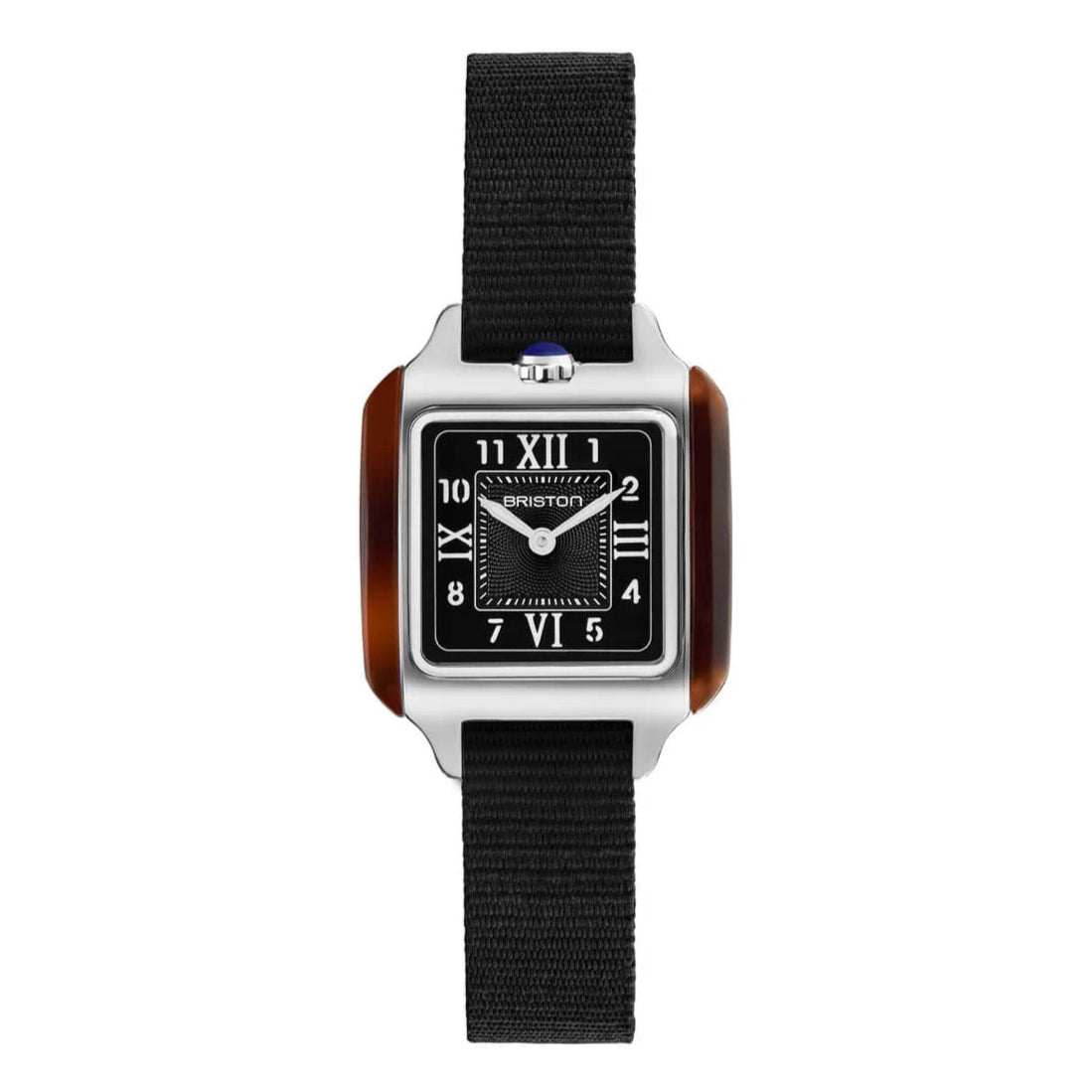 La Briston Streamliner Kennedy Petite 252025.SA.T.1.NB incarne une version miniaturisée mais pleinement expressive de la collection Kennedy. Avec ses 25 × 25 mm, son boîtier acier poli flanqué d’acétate écaille, couronne à 12 h sertie d’un cabochon lapis-lazuli, la Kennedy Petite apporte charme, discrétion et style vintage résolu, tout en restant féminine et raffinée. Le cadran noir semi-lustré, décor guilloché central, chiffres romains et arabes évidés, aiguilles dauphine avec inserts luminescents font de la Kennedy Petite un bijou au poignet : discret mais marqué.