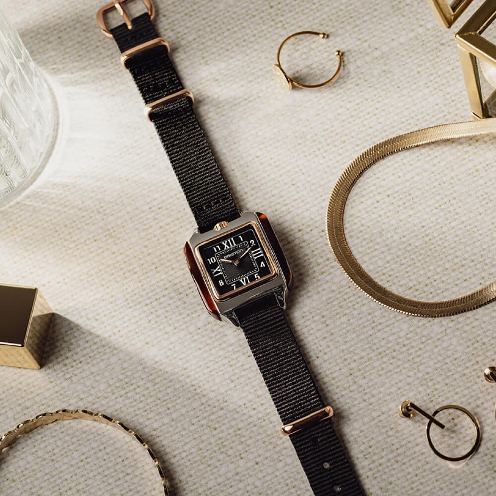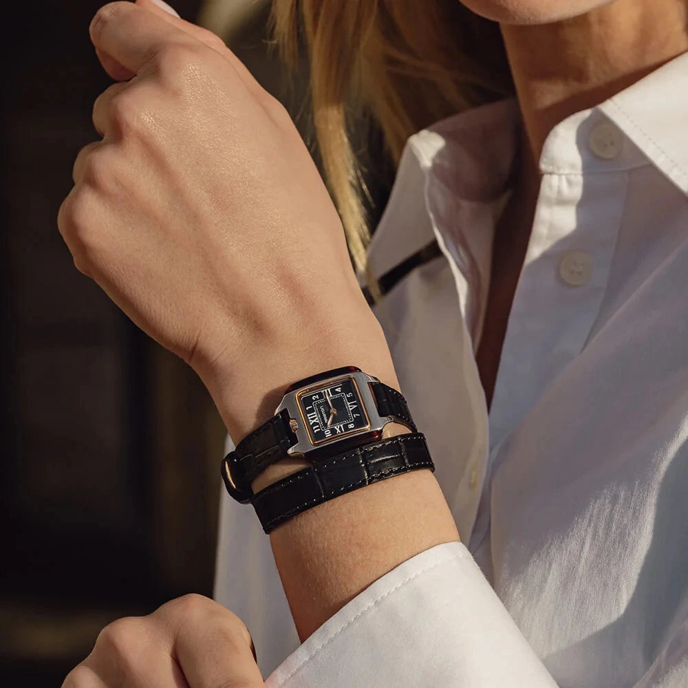 Boîtier : Acier inoxydable 316L poli, flancs en acétate écaille tortue, forme carrée 25 × 25 mm, ouverture cadran 17 × 17 mm, épaisseur ≈ 7,4 mm