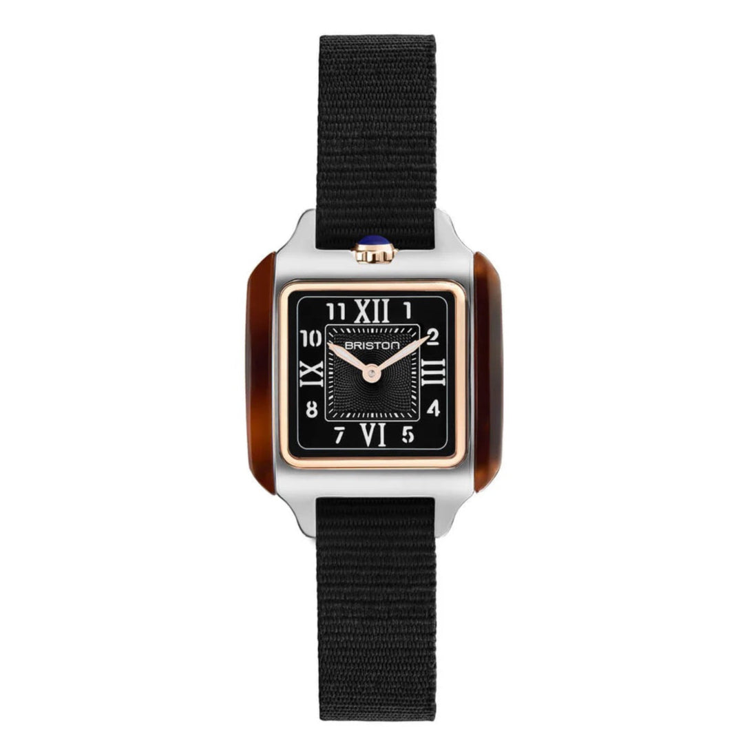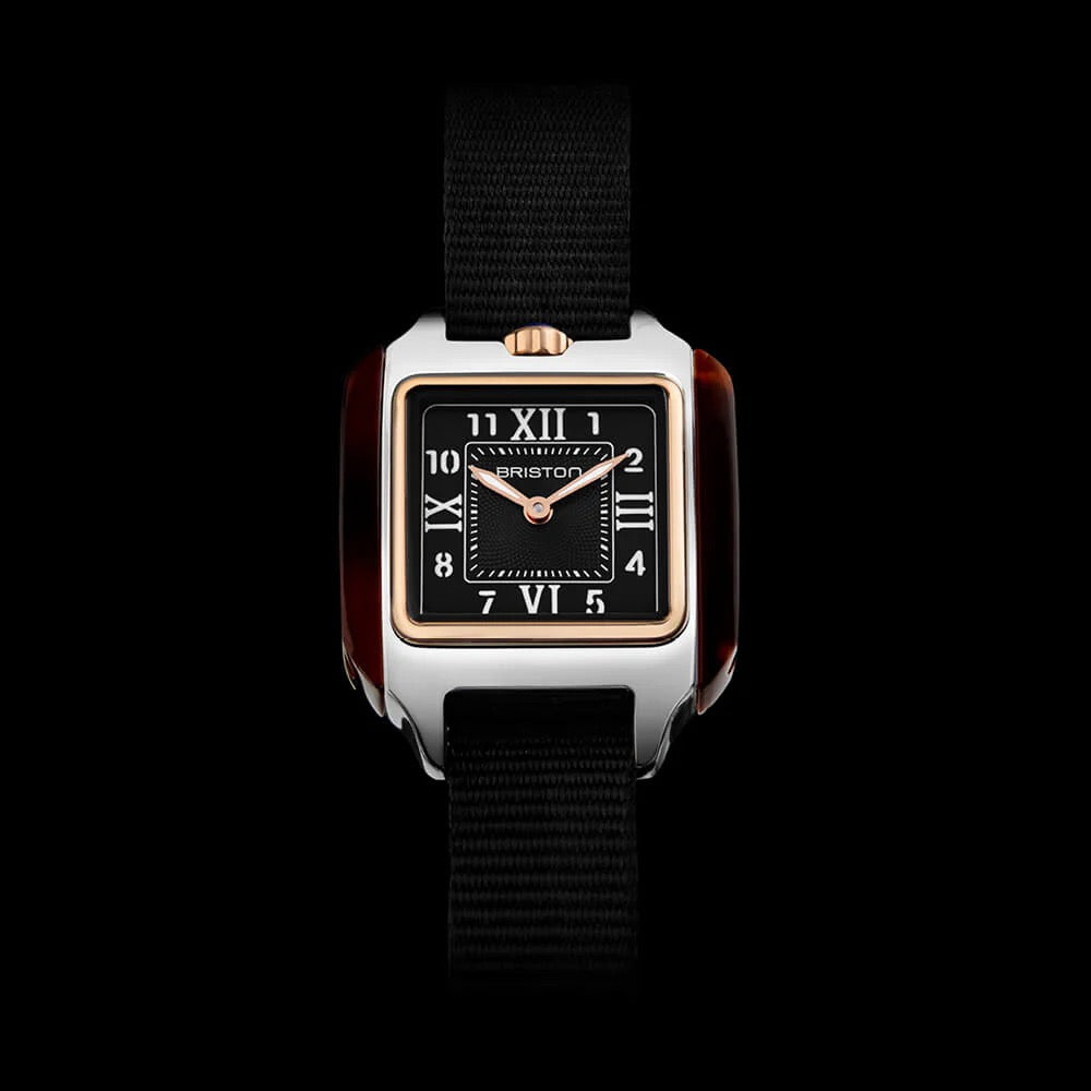 La Briston Streamliner Kennedy Petite 252025.PRA.T.1.NB incarne une version miniaturisée mais pleinement expressive de la collection Kennedy. Avec ses 25 × 25 mm, son boîtier acier poli flanqué d’acétate écaille, couronne à 12 h sertie d’un cabochon lapis-lazuli, la Kennedy Petite apporte charme, discrétion et style vintage résolu, tout en restant féminine et raffinée. Le cadran noir semi-lustré, décor guilloché central, lunette dorée, chiffres romains et arabes évidés, aiguilles dauphine dorées avec inserts luminescents font de la Kennedy Petite un bijou au poignet : discret mais marqué.