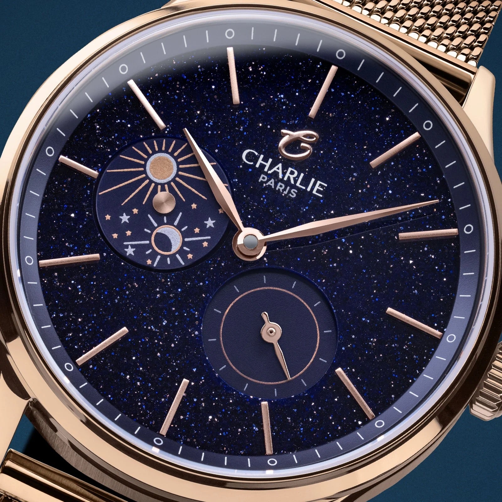 La Charlie Paris Initial 36 Jour/Nuit Aventurine incarne l’équilibre entre élégance, poésie et horlogerie moderne. Son boîtier en acier 316L PVD doré rose, poli et brossé, de 36 mm de diamètre, abrite un cadran en aventurine bleu nuit, parsemé de fines paillettes évoquant un ciel étoilé — une finition qui capte la lumière et sublime la fonction jour/nuit de la montre.