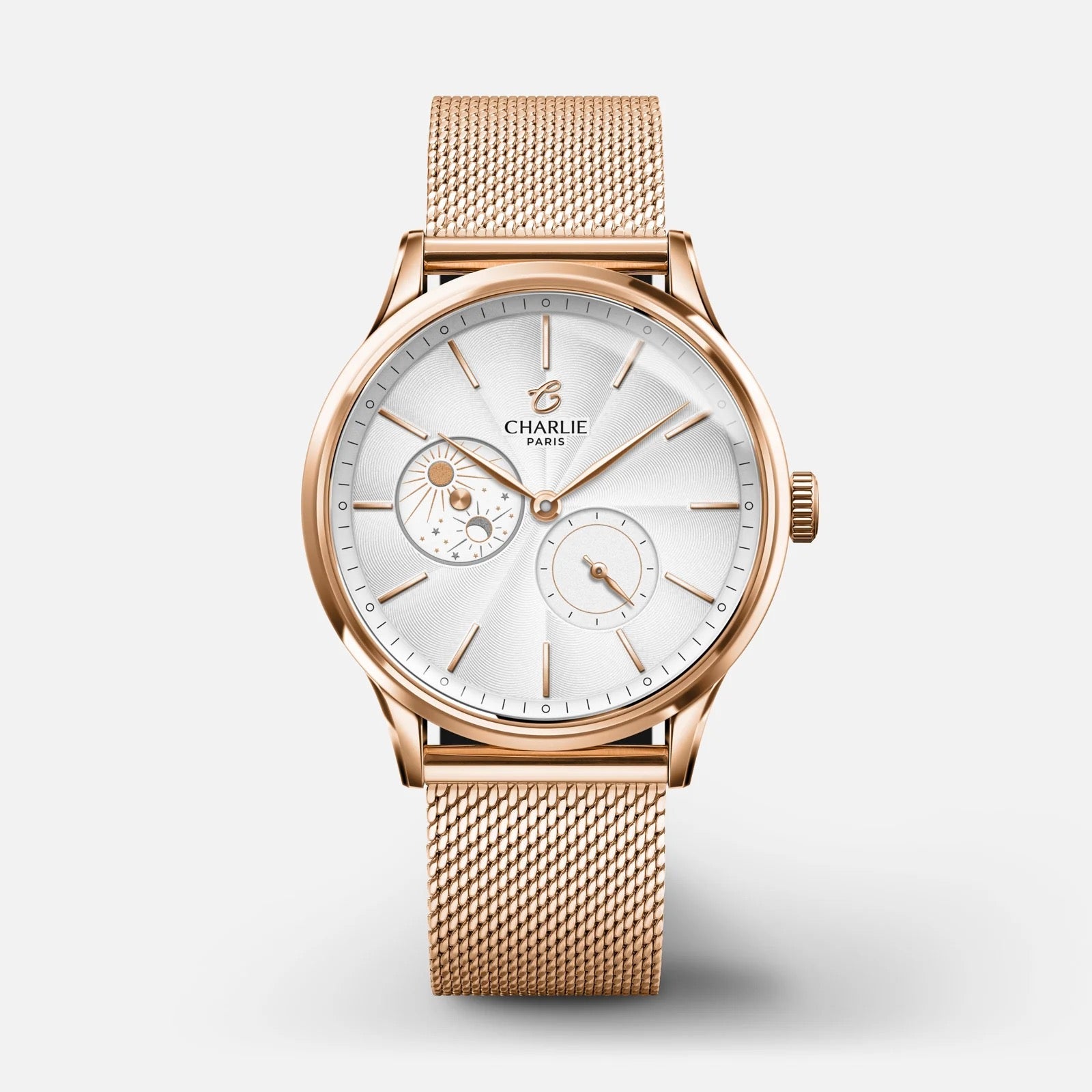 La Charlie Paris Initial 36 Jour/Nuit Or Rose incarne l’équilibre entre élégance, poésie et horlogerie moderne. Son boîtier en acier 316L PVD doré rose, poli et brossé, de 36 mm de diamètre, abrite un cadran en blanc guilloché.