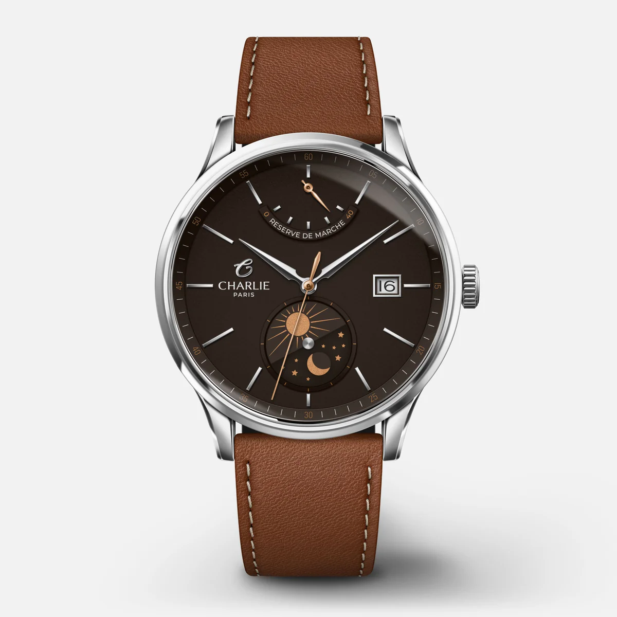 La Charlie Paris Initial Réserve de Marche Jour‑Nuit Marron (Initial Automatic Day/Night Power Reserve) allie élégance classique et fonctionnalités modernes. Son boîtier en acier 316L poli‑brossé de 40 mm, avec des cornes droites, propose un design à la fois sobre et expressif. Le cadran marron légèrement sablé présente les complications utiles : réserve de marche à 12 h, date à 3 h et disque jour/nuit à 6 h, complétés par une petite seconde intégrée dans la lecture centrale.