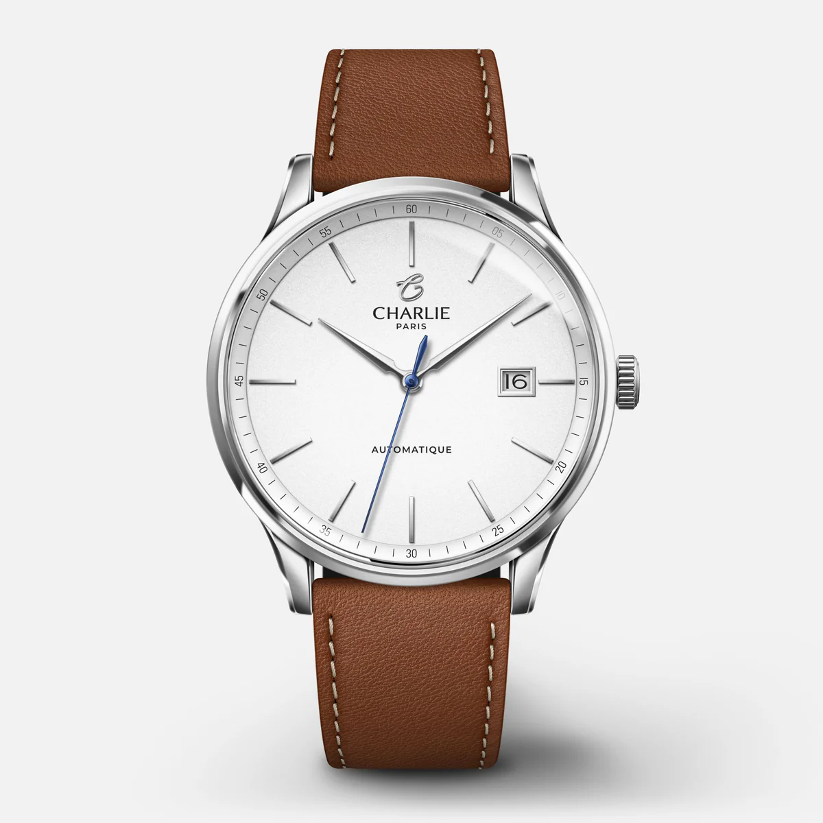 La Charlie Paris Initial Slim Blanc est une montre automatique au design raffiné, conçue pour les amateurs de sobriété. Son boîtier en acier inoxydable 316L poli‑brossé mesure 40 mm de diamètre et ne fait que 8,6 mm d’épaisseur, lui conférant une élégance discrète. Le cadran blanc légèrement sablé présente une date à 3 h, des index appliqués et des aiguilles glaive polies, le tout sous un verre saphir bombé traité anti‑reflets.