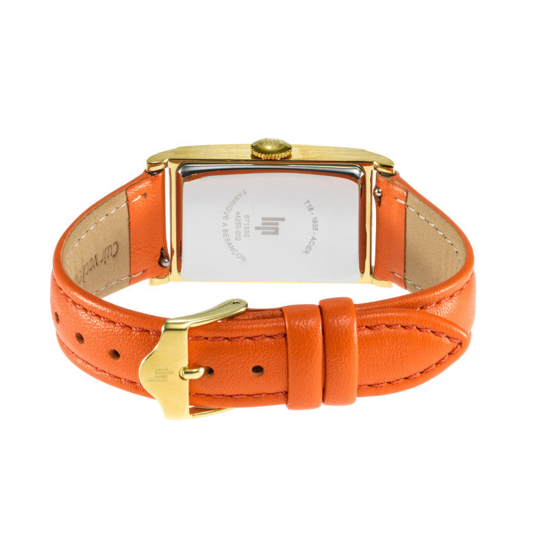 Le bracelet en cuir de vachette lisse orange, avec surpiqûres ton sur ton, apporte une touche d'originalité et de modernité à cette montre classique. Animée par un mouvement à quartz suisse Ronda 1064, la LIP Churchill T18 - 671930 garantit une précision fiable au quotidien.