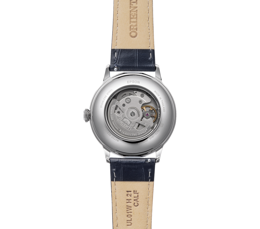 Animée par un mouvement automatique manufacture Orient, la Bambino 40,5 mm bénéficie du remontage manuel et de la fonction stop-seconde, garantissant précision et confort d’utilisation. Son fond transparent permet d’admirer le mouvement en action, confirmant l’ADN mécanique propre à Orient.