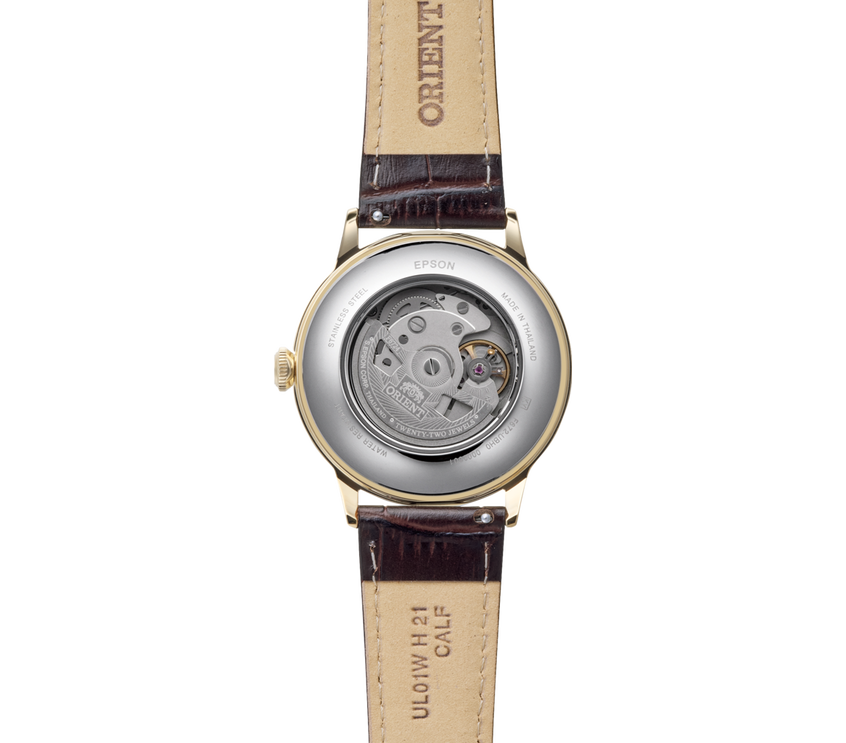 Animée par un mouvement automatique manufacture Orient, la Bambino dorée bénéficie du remontage manuel et de la fonction stop-seconde, garantissant précision et confort d’utilisation. Son fond transparent permet d’admirer le mouvement en action, confirmant l’ADN mécanique propre à Orient.