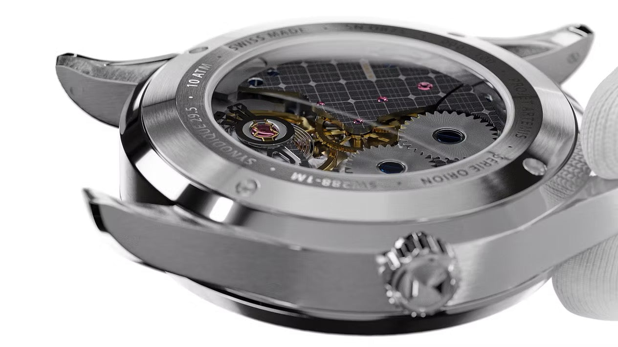 Montée sur un bracelet cuir, la Mu:n Orion Blanche arbore un fond transparent qui dévoile le calibre mécanique suisse Sellita SW288 à remontage manuel, réglé pour une précision de ±7 s/jour, fréquence 4 Hz, réserve de marche d’environ 41 heures. La montre offre également une complication phase de lune + date, ainsi qu’une étanchéité confortable de 10 ATM (100 m), ce qui la rend adaptée à un usage quotidien, même en milieu actif.