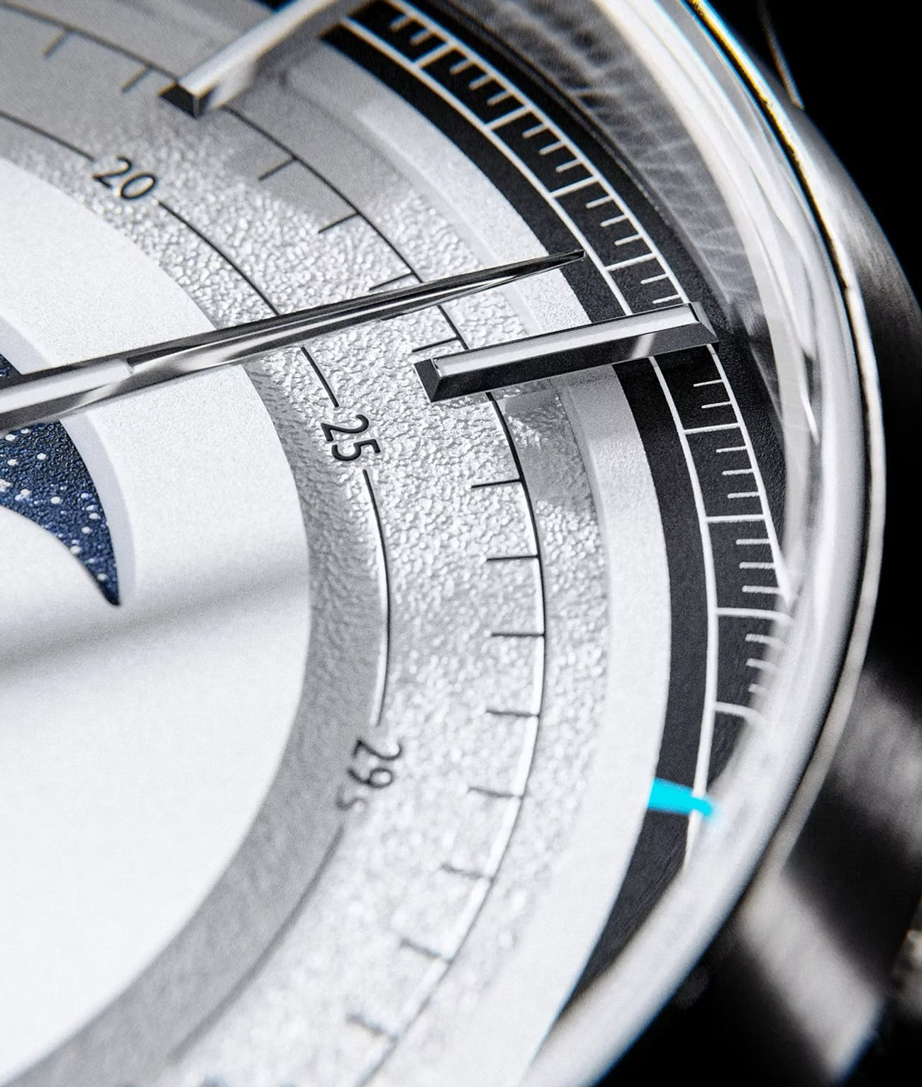 Le cadran blanc, à deux niveaux, mêle sobriété et chic : la partie supérieure évoque la surface lunaire, tandis que des index appliqués parcourus de Super-LumiNova assurent une lecture nette de jour comme de nuit.