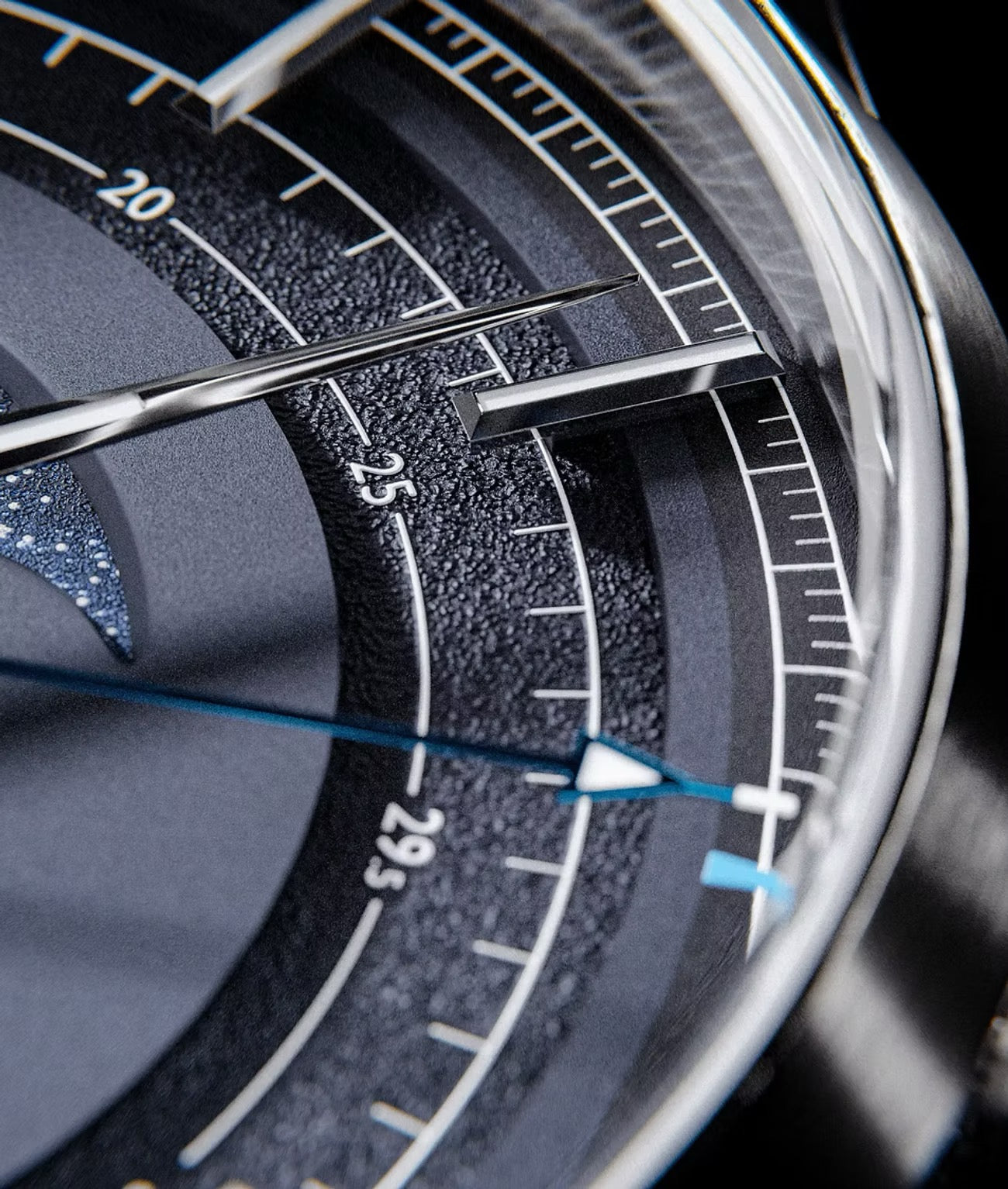 Le cadran gris sombre, à deux niveaux, mêle sobriété et chic : la partie supérieure évoque la surface lunaire, tandis que des index appliqués parcourus de Super-LumiNova assurent une lecture nette de jour comme de nuit.