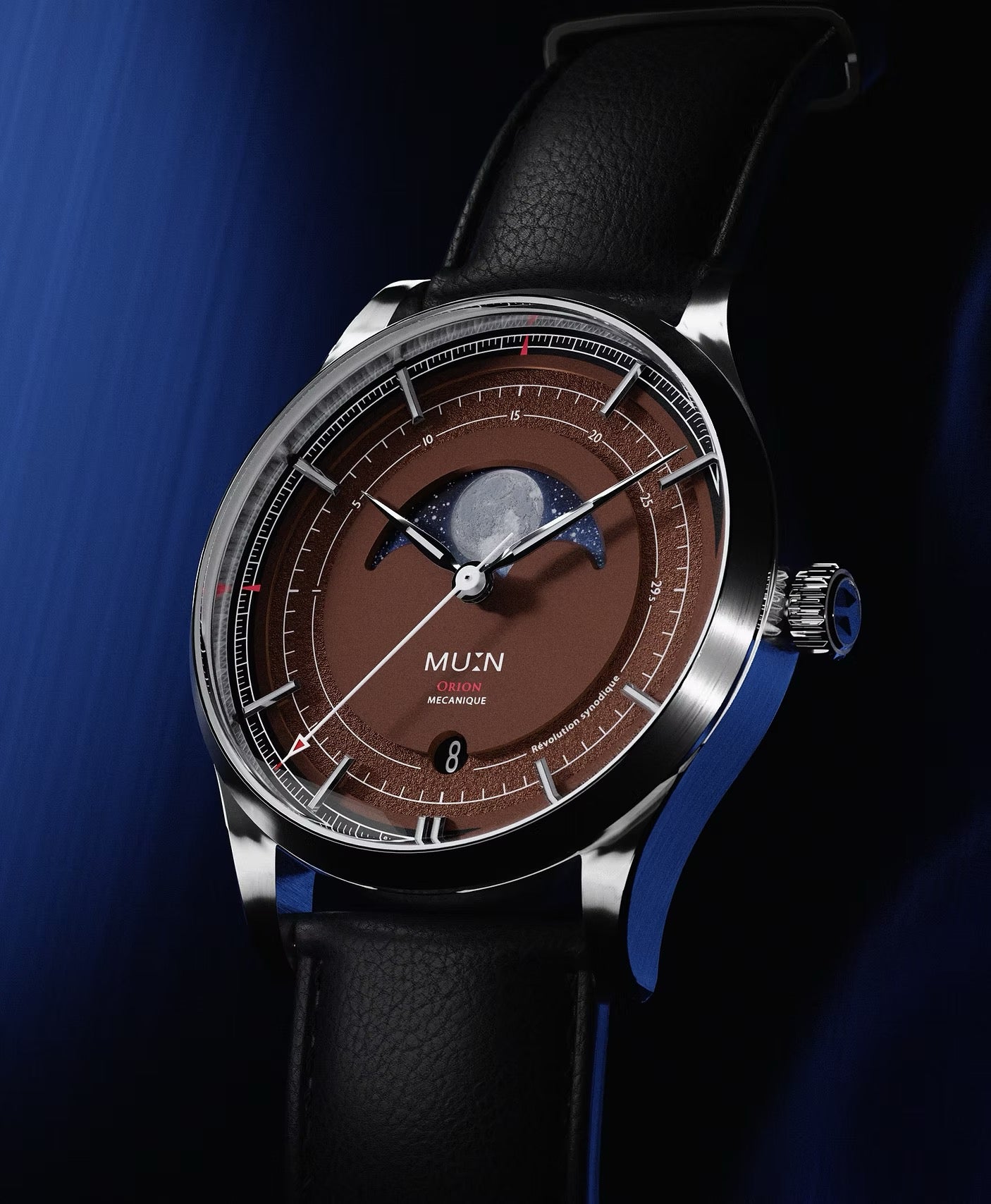 La MU:N Orion Marron séduit par son équilibre parfait entre complication horlogère et design minimaliste. Son diamètre de 38 mm convient à tous les poignets, tandis que sa phase de lune en fait une pièce à la fois poétique et technique. Avec son mouvement suisse fiable, son verre saphir et son étanchéité 100 m, la Mu:n Orion marron offre une combinaison rare de robustesse, de finesse et d’élégance. C’est une montre pensée pour durer, élégante en toutes circonstances et dotée d’un charme visuel unique propre à l’univers de MU:N Watches.