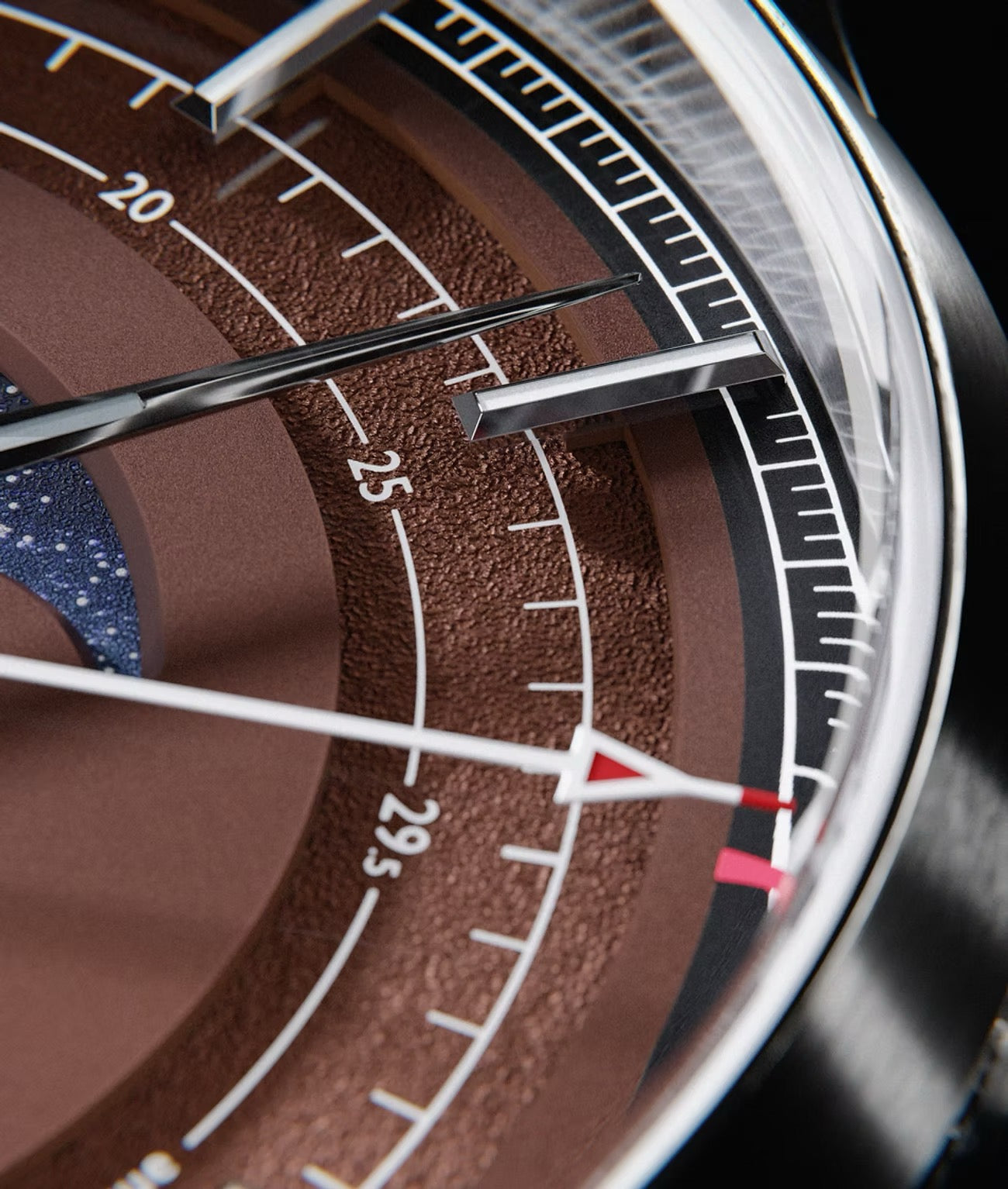 Le cadran marron, à deux niveaux, mêle sobriété et chic : la partie supérieure évoque la surface lunaire, tandis que des index appliqués parcourus de Super-LumiNova assurent une lecture nette de jour comme de nuit.
