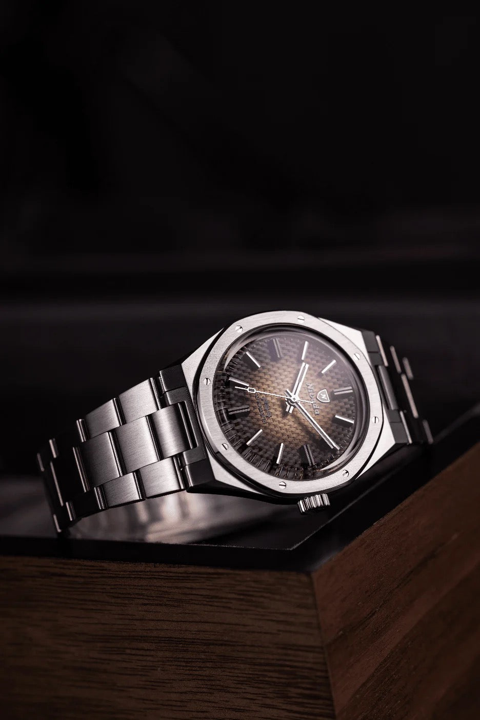 Depuis 1926, Nivada Grenchen développe des montres suisses emblématiques faites pour résister au temps. Chronomaster, Antarctic ou encore Depthmaster, tous ces noms ont marqué l'histoire de l'horlogerie. Avec la F77 marron fumé, Nivada Grenchen relance son modèle sport-chic des années 70, combinant authenticité vintage et fiabilité contemporaine.