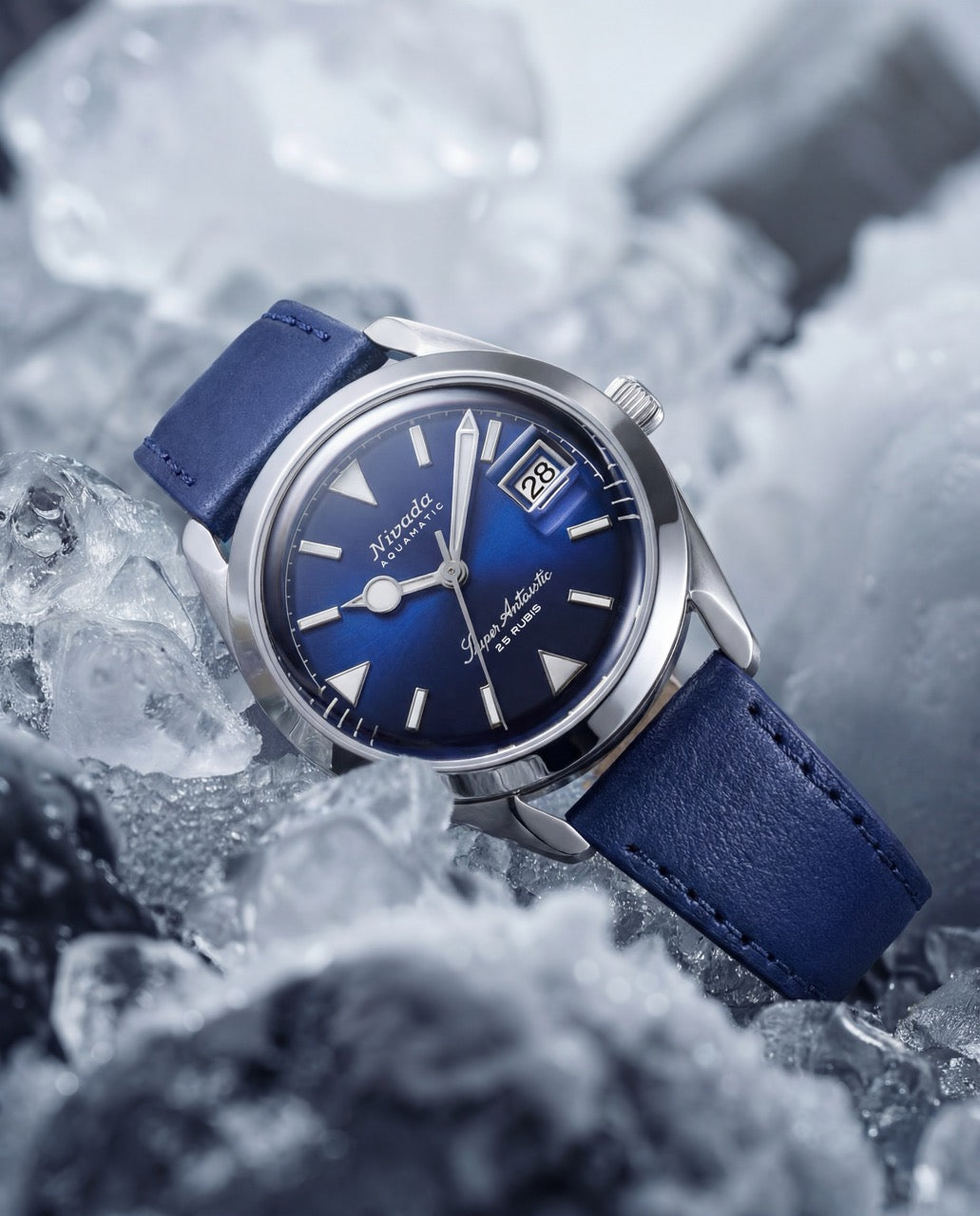 La Nivada Grenchen Super Antarctic bleue se distingue enfin par son choix de bracelet, renforçant sa polyvalence tout en assurant un confort optimal. Ce modèle affirme avec force l’ADN de la marque Nivada Grenchen : celui d’une horlogerie robuste, historique et intemporelle.