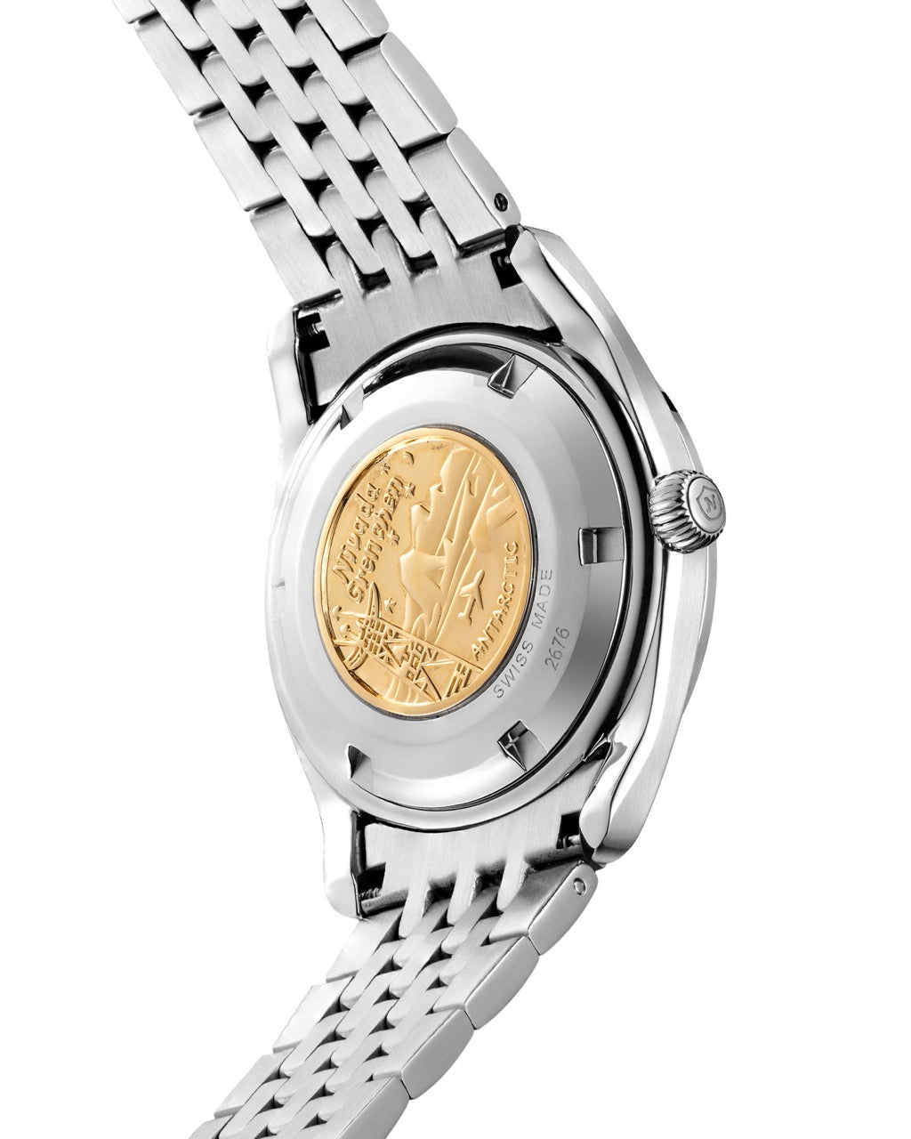 Son boîtier en acier inoxydable 316L, de 38 mm de diamètre pour 11 mm d’épaisseur (verre inclus), offre un format compact et polyvalent. Le verre saphir double dôme, combiné au fond vissé orné d’un médaillon gravé rappelle les origines polaires de la collection Antarctic. À l’intérieur, on retrouve le mouvement automatique suisse Soprod P024, gage de fiabilité et de précision.