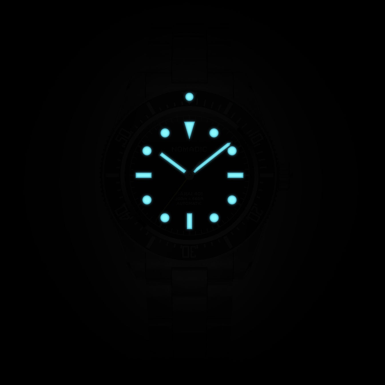 La Nomadic Pitch Black Maraí 401 est une plongeuse inspirée des côtes irlandaises, alliant robustesse et élégance. Son boîtier en acier 316L de 40 mm abrite le calibre Sellita SW200-1, un mouvement automatique suisse fiable et précis. Son cadran noir mat, souligné d’index et d’aiguilles luminescents Super-LumiNova BGW9, assure une excellente lisibilité. Verre saphir double dôme antireflet, lunette céramique 120 clics et fond vissé gravé complètent l’ensemble. Étanche à 200m, la Nomadic Pitch Black Maraí 401 est montée sur un bracelet acier à micro-ajustement, parfait pour la plongée comme pour le quotidien.