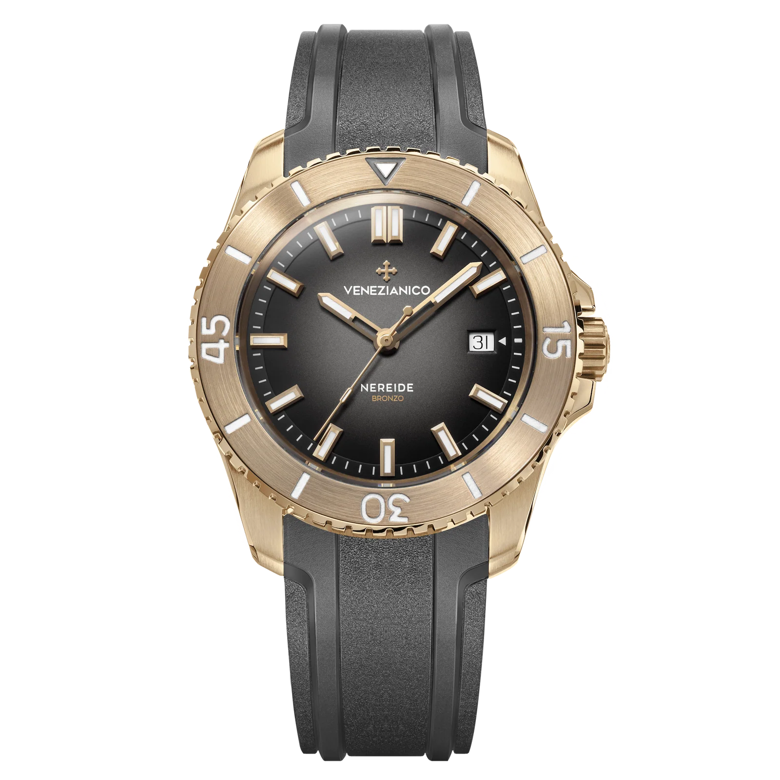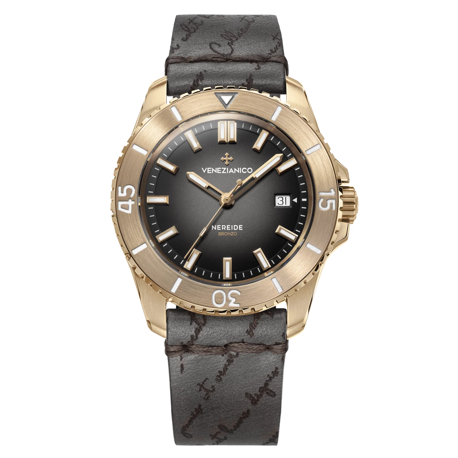 La Venezianico Nereide Bronzo met en scène un boîtier en bronze marin QAl9-4 de 42 mm qui prendra une patine unique. Protégée par un verre saphir antireflet et dotée d’index/aiguilles BGW9, la Venezianico Nereide Bronze assure une lisibilité optimale. Sa lunette unidirectionnelle en bronze à 120 clics, sa couronne vissée et une étanchéité portée à 30 ATM (300 m) en font une vraie tool-watch. Le cadran fumé semi-mat apporte de la profondeur, tandis que le fond acier 316L vissé, gravé des chevaux de Saint-Marc, relie la montre à l’iconographie vénitienne. Au quotidien, la Nereide Bronzo conserve une allure sportive et élégante. Livrée sur bracelet caoutchouc Made in Italy, la Nereide Bronze mêle confort et caractère.