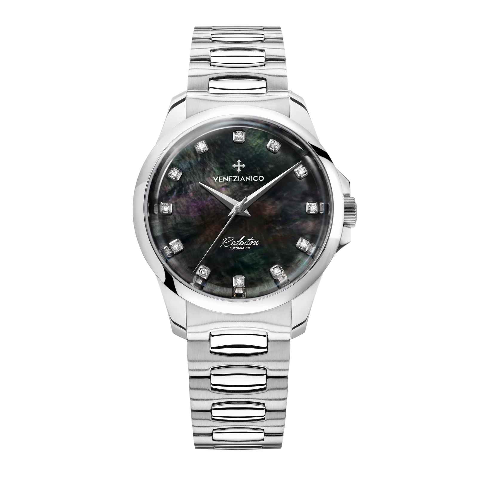 La Venezianico Redentore 36 Diamond incarne une féminité raffinée alliée à une mécanique fiable. Son cadran en Mother of Pearl subtile serti de 12 diamants synthétiques (0,14 Carats) capte la lumière avec grâce tandis que le boîtier de 36 mm, inspiré des lignes néoclassiques vénitiennes, souligne l’élégance contemporaine de la Venezianico Redentore 36 Diamond. Porté par un bracelet Canova acier aux finitions satinées et polies, la Venezianico Redentore 36 Diamond révèle toute la quintessence horlogère de la marque.