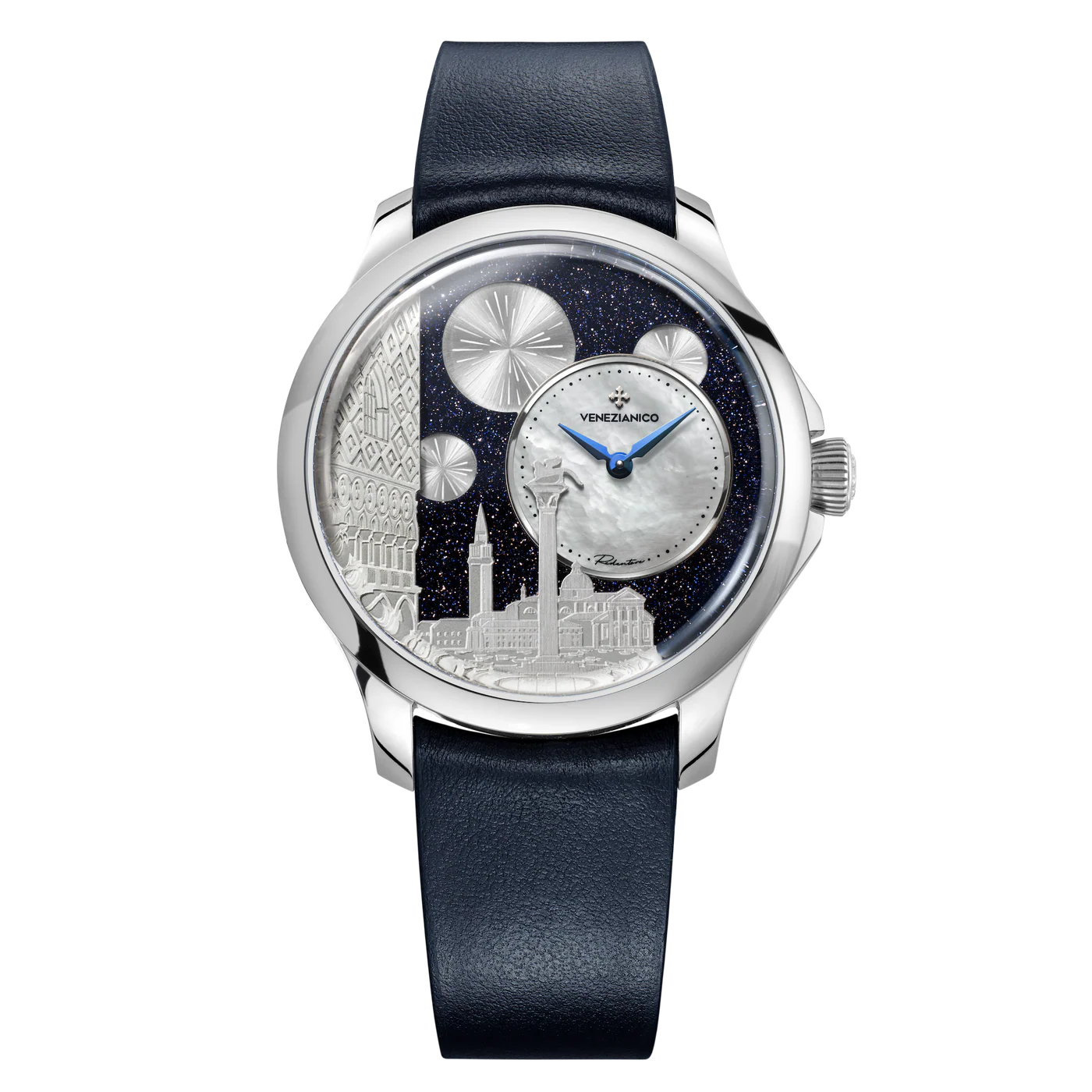 La Venezianico Redentore Bellanotte transforme le temps en invitation au rêve : sur un cadran complexe à quatre niveaux, une nuit étoilée en aventurine accueille un compteur décentré en nacre, tandis que feux d’artifice et bas-reliefs en rhodium évoquent la fête du Redentore à Venise. Chaque Venezianico Redentore Bellanotte raconte ainsi l’âme nocturne de la Sérénissime dans une précision horlogère.