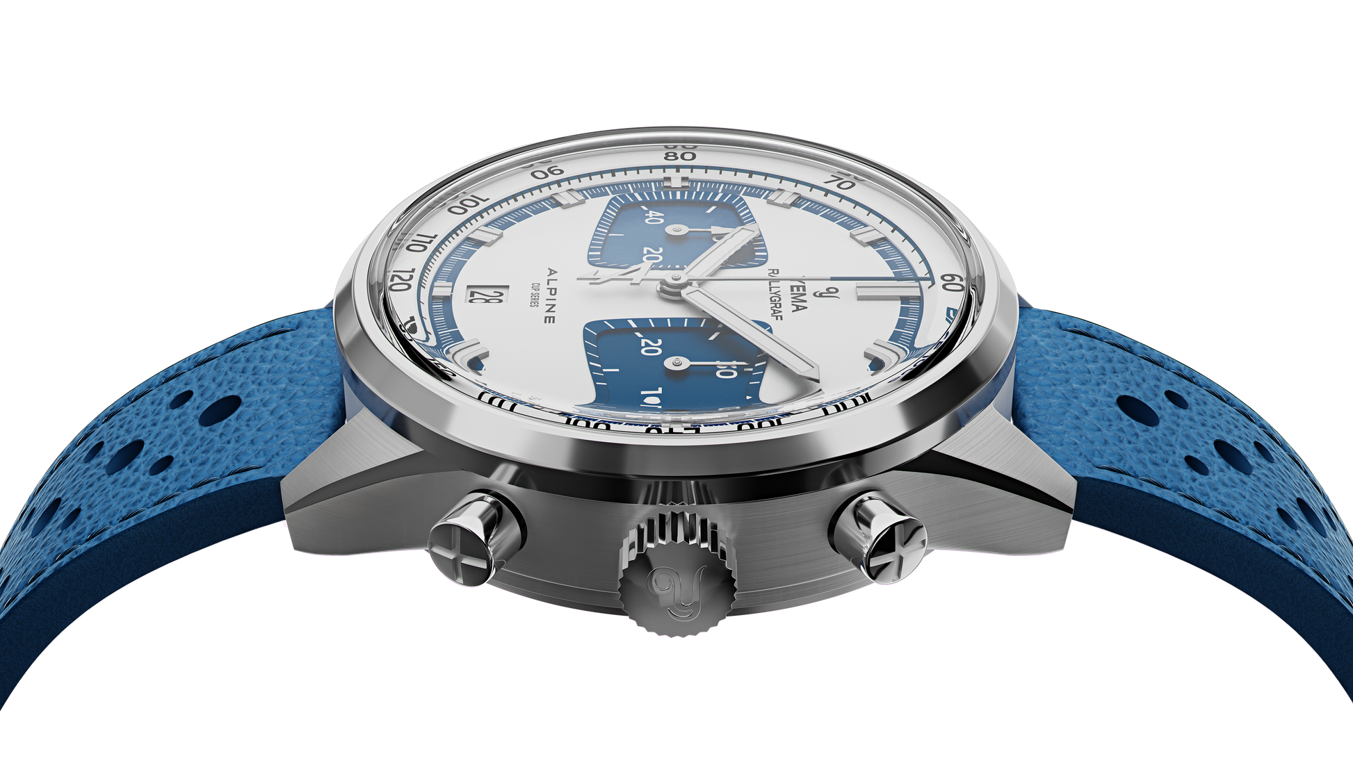 Cadran : Blanc “panda” avec sous-compteurs bleus, échelle tachymétrique interne, date à 6H, trotteuse logo Alpine à bout bleu