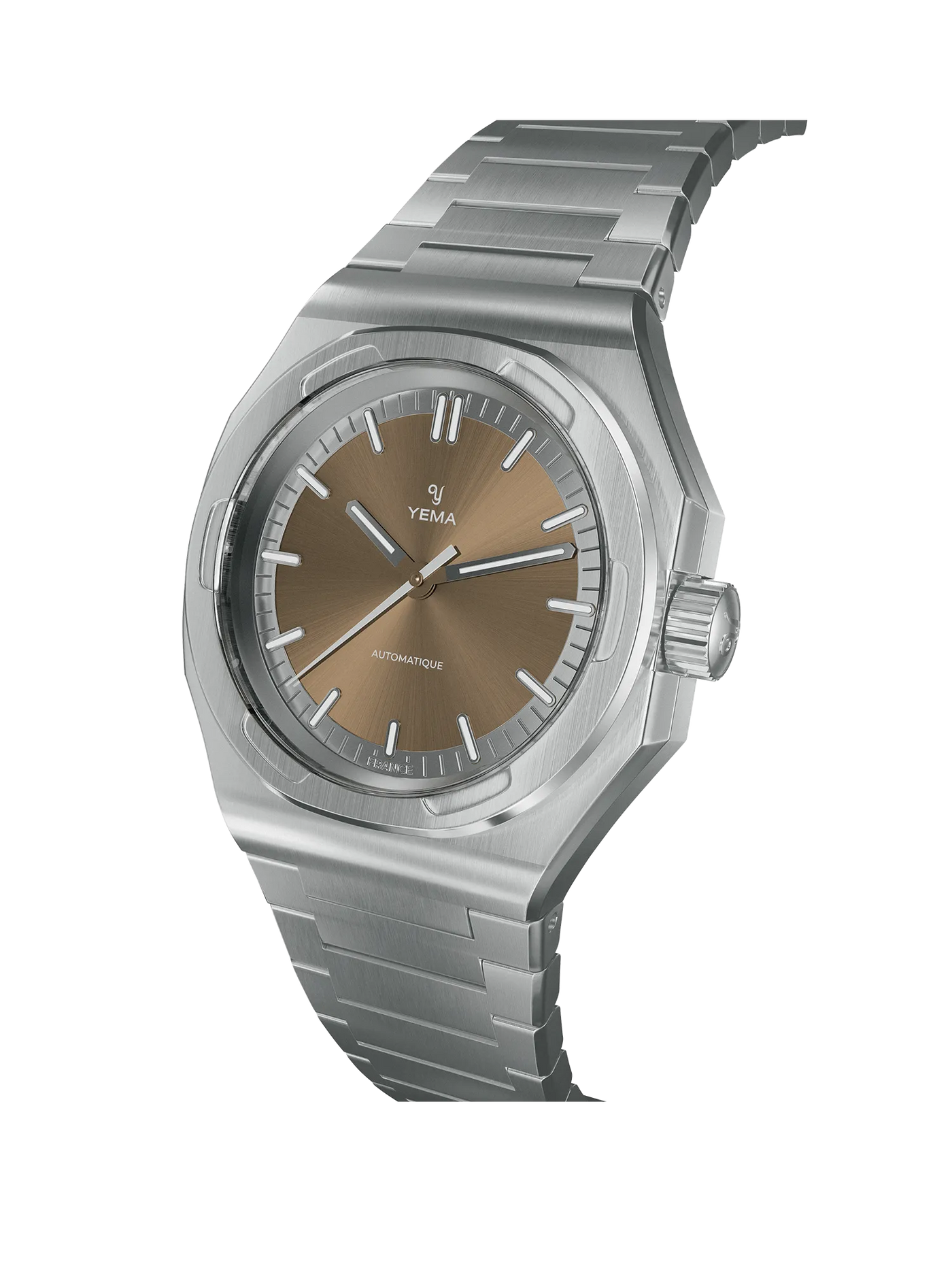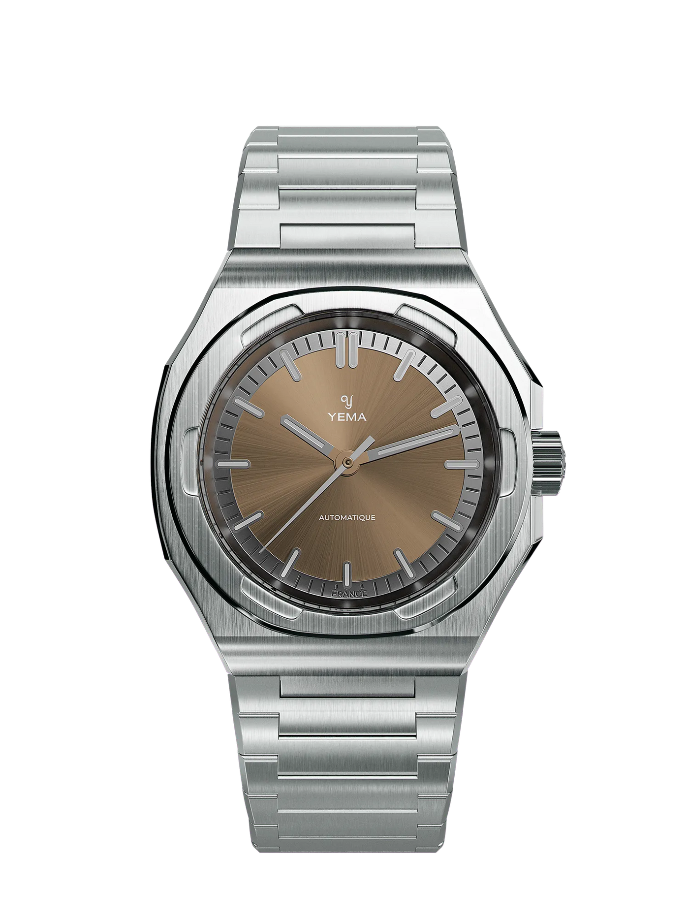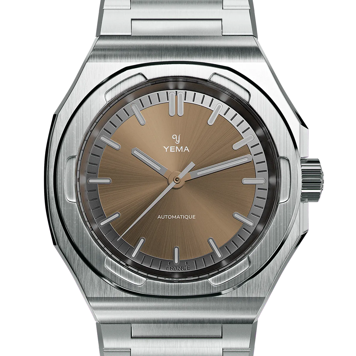 La Yema Urban Traveller marron allie raffinement contemporain et fiabilité mécanique. Dotée d’un boîtier en acier 316L de 39 mm aux finitions brossées et polies, cette Yema Urban Traveller se distingue par son cadran soleillé brossé circulaire protégé par un verre saphir antireflet. Animée par le mouvement automatique suisse Sellita SW200-1, la Yema Urban Traveller offre une réserve de marche de 38 heures. Son fond gravé vissé révèle la beauté du logo, tandis que le bracelet acier intégré assure confort et élégance. Étanche à 100 m, la Urban Traveller marron s’adapte à toutes les situations, de la ville aux voyages.